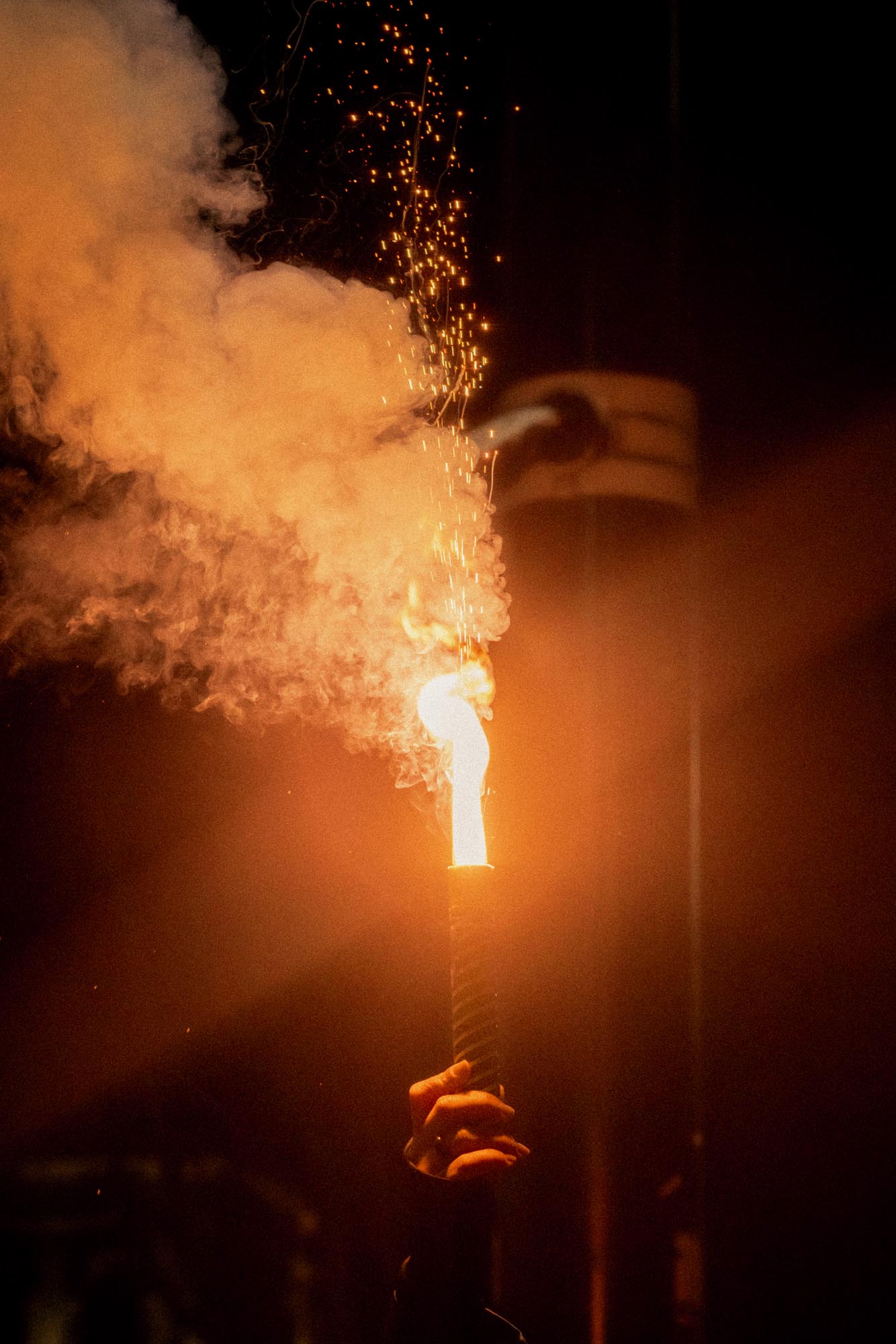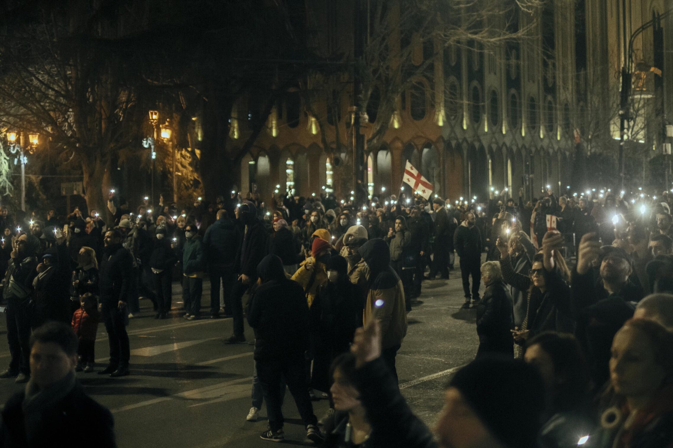 Sanger og rop gjennom megafoner runger i gatene av Tbilisi, og flere skyter fyrverkeri og nødbluss.