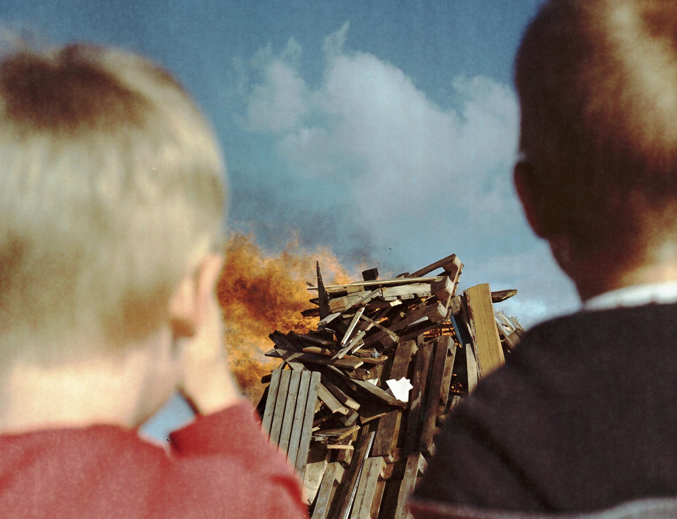 To gutar med perfekt utsikt mot det store, tradisjonsrike jonsokbålet.