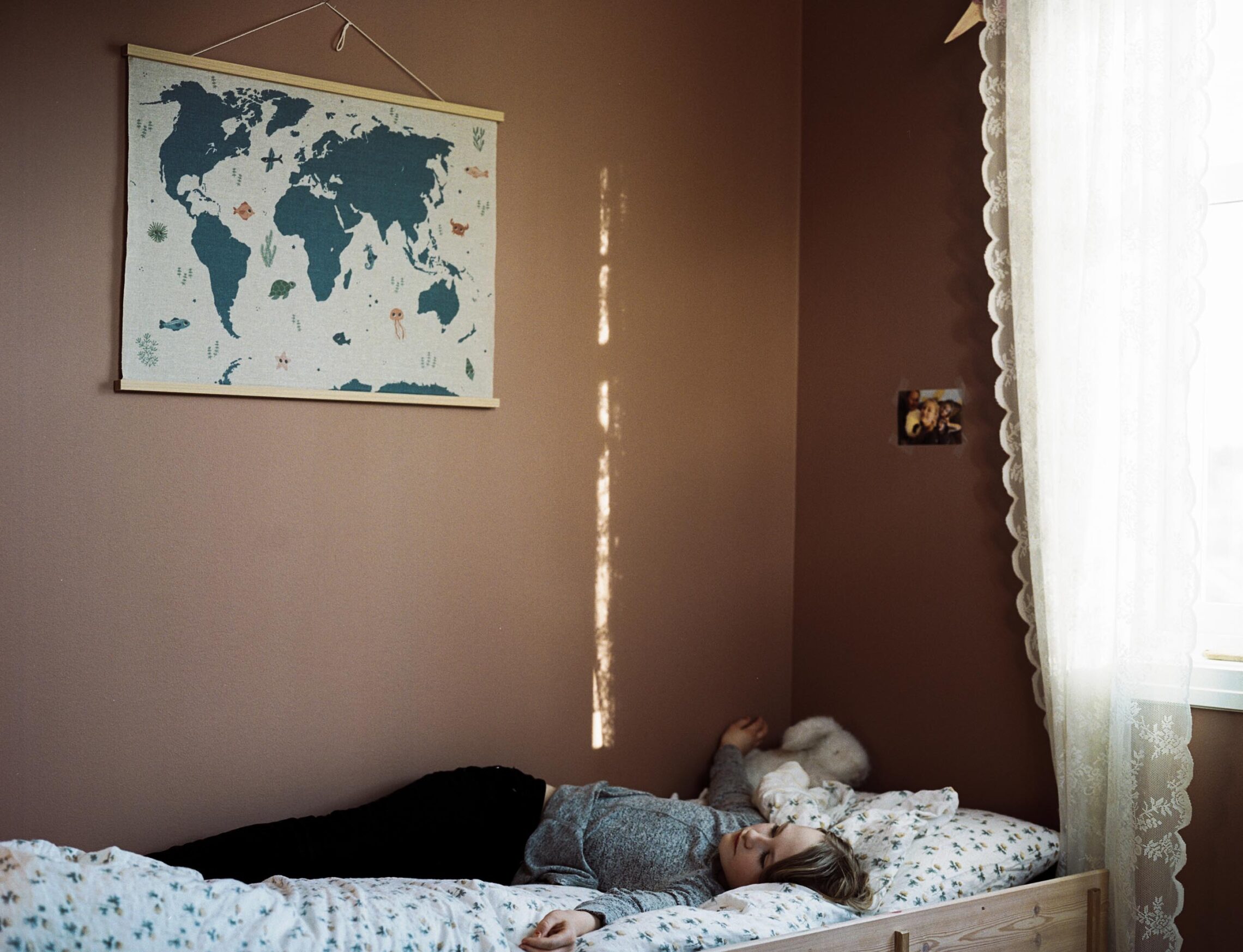 Johanna, ei av nabojentene, ser undrande opp på verdskartet.