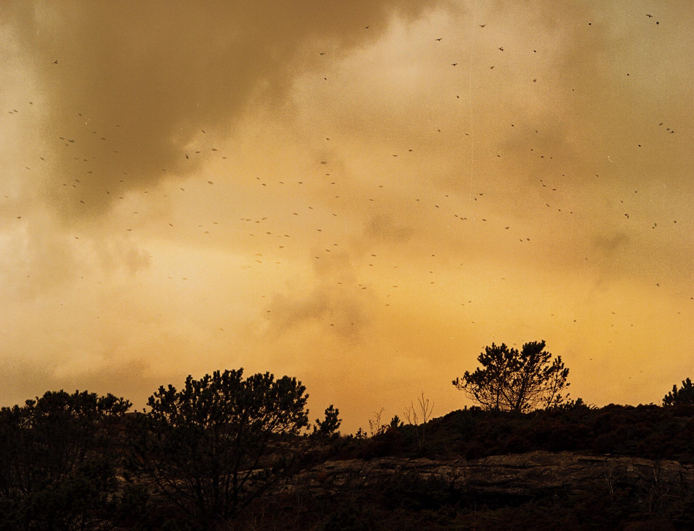 Ein fugleflokk i vinden lettar frå berga ved fjorden.