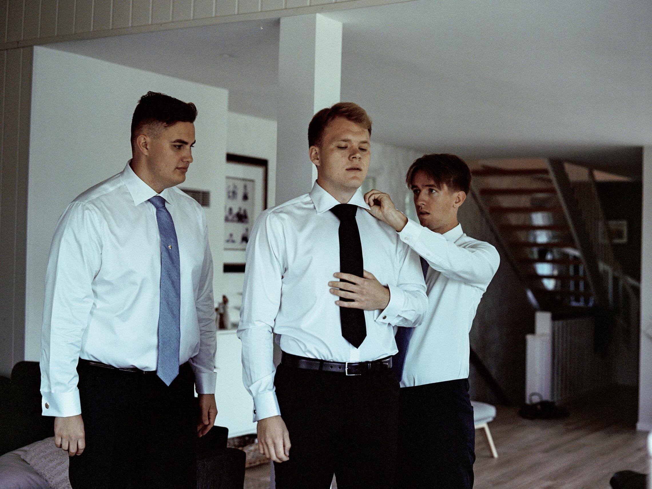 Nerver og kjærleik: Konsentrert gjer Noah (21) siste finpuss på skjortekragen til bror min Elias (22) før Magnus (20) køyrer han til kyrkja. Om ein time skal Elias gifta seg.