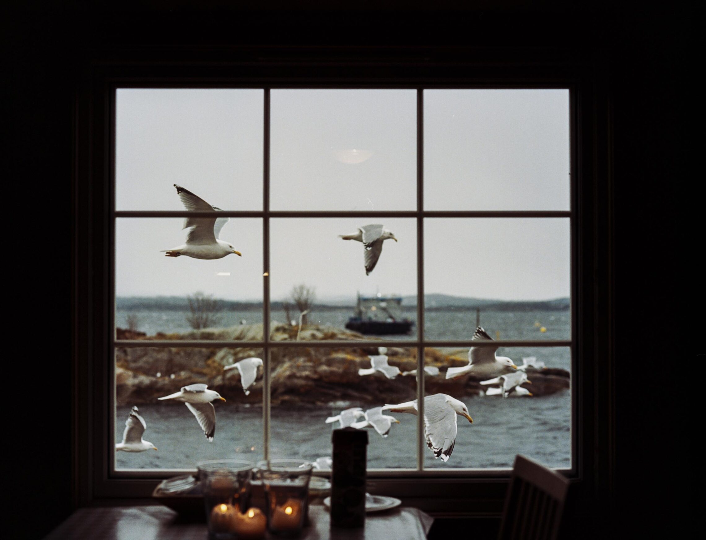 Frå vindauget på naustet vårt, denne dagen med ein vind som let måsane kvile i lufta medan dei ventar på slo frå fiskarane under.