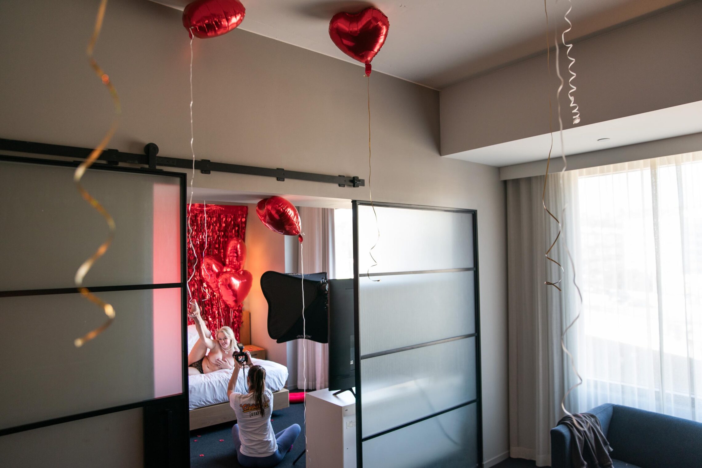 Bildet viser filmsettet til regissør Inka Winter i LA. For henne er det viktig med mangfold i sine produksjoner. Til høyre i bildet ser vi en transkvinne på jobb denne dagen. Hennes partner, som hun nettopp har giftet seg med, er transmann og deltar også på orgien.