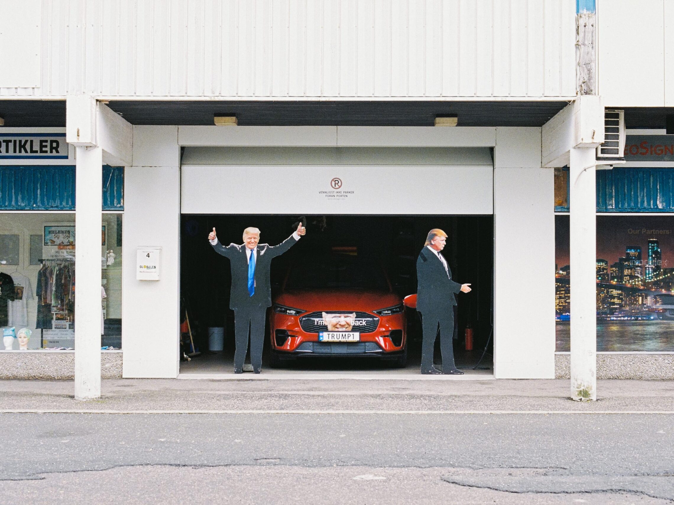 Garasjeporten til Globalen Reklame blir åpnet for å vise frem Teslaen med nummerskiltet “TRUMP1” og to pappfigurer av USAs 45 og 47 president.