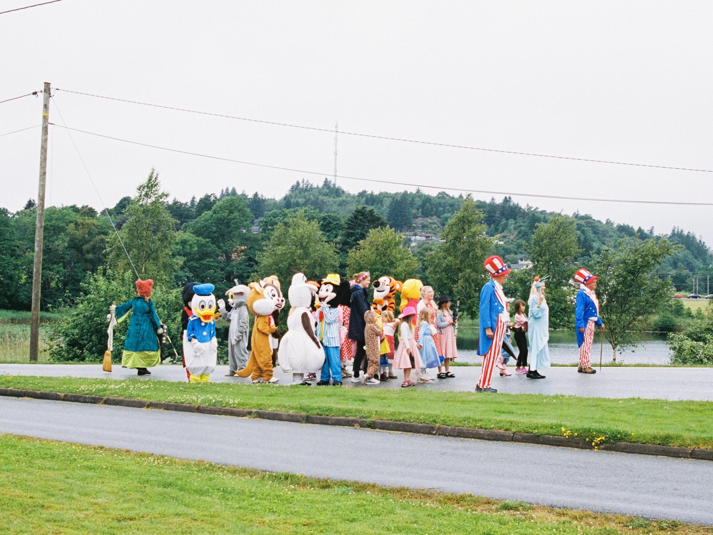 Street Parade under American Festival i Vanse. Toget har midlertidig stoppet opp, og Disneykarakterene blir stående i ro på Fylkesvei 43.