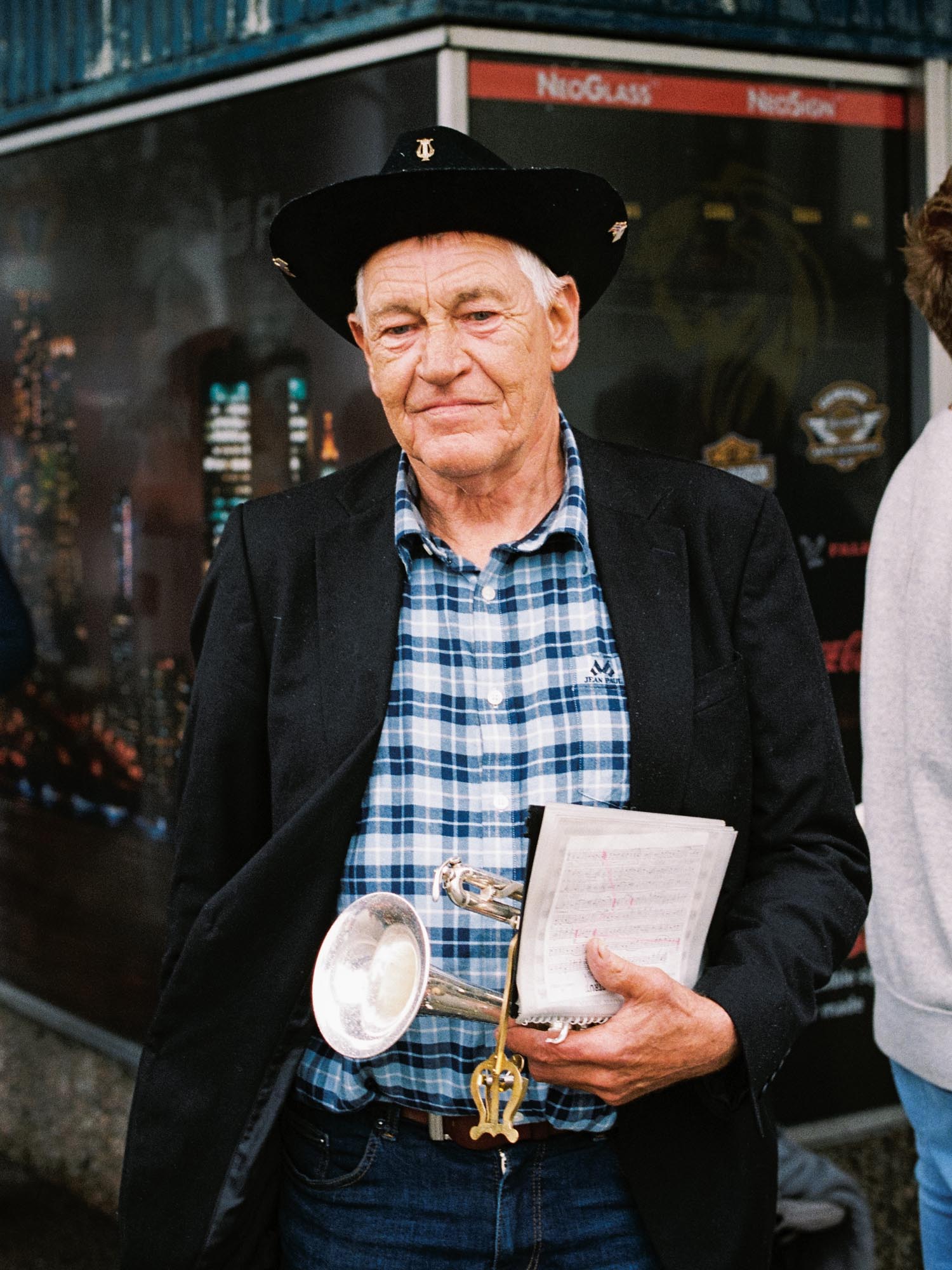 Et medlem av Vanse Brass Band fotografert etter en konsert på den årlige American Festival.